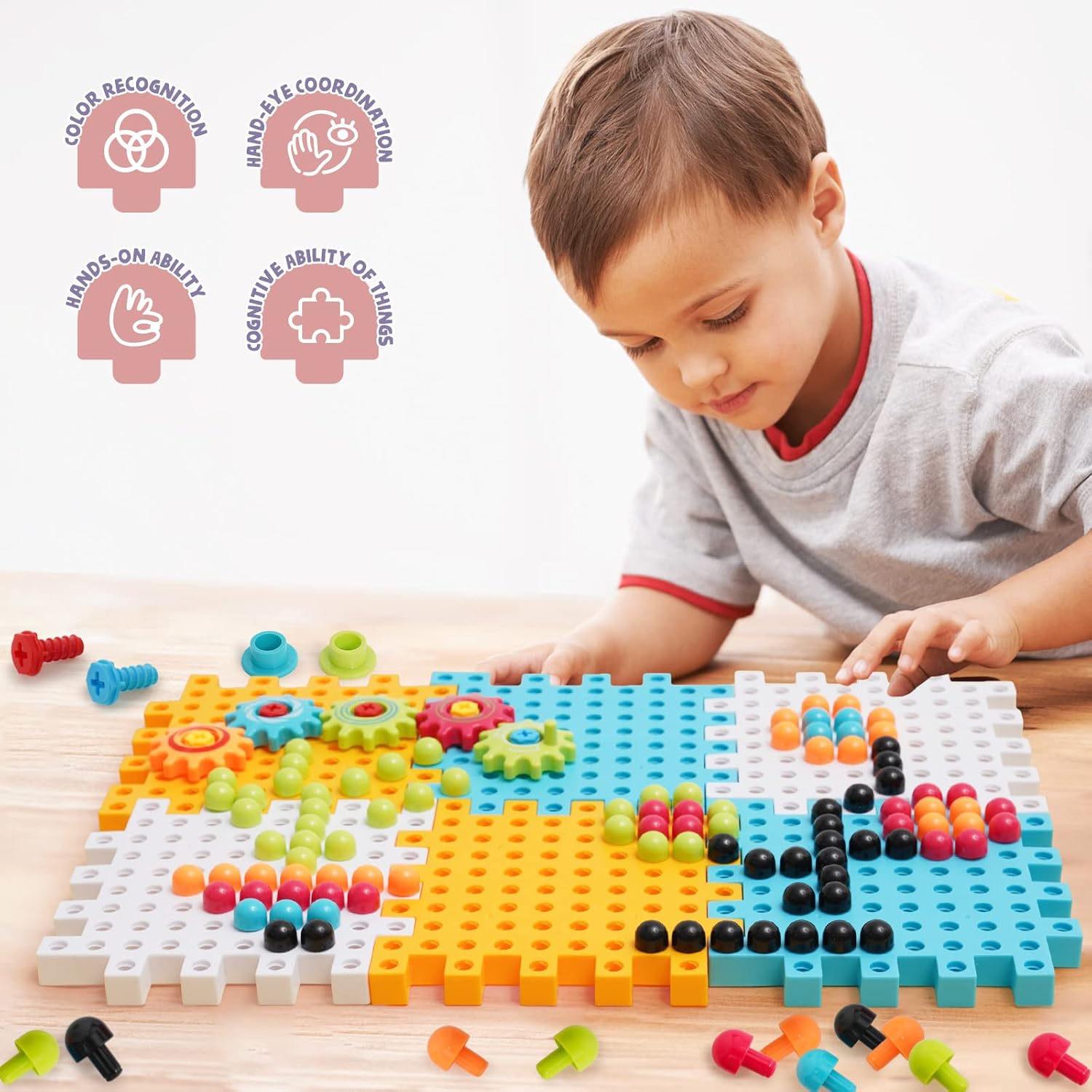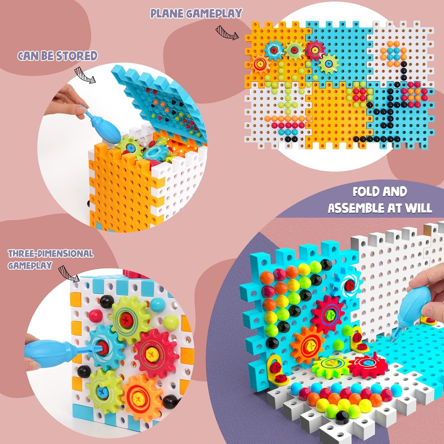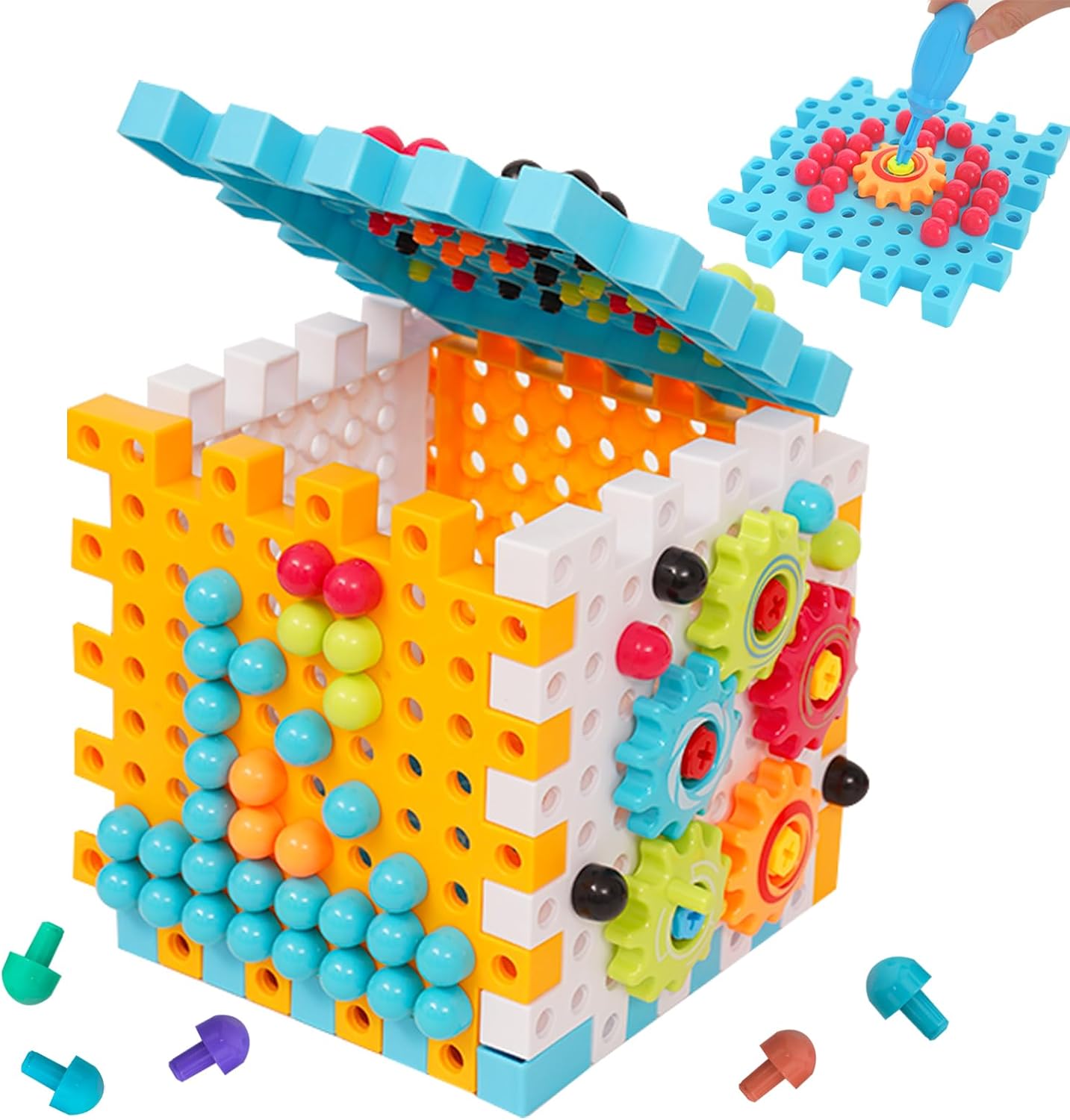 ✔ 110 piezas versátiles → Clavijas tipo hongo, engranajes, tornillos, tuercas y destornillador.