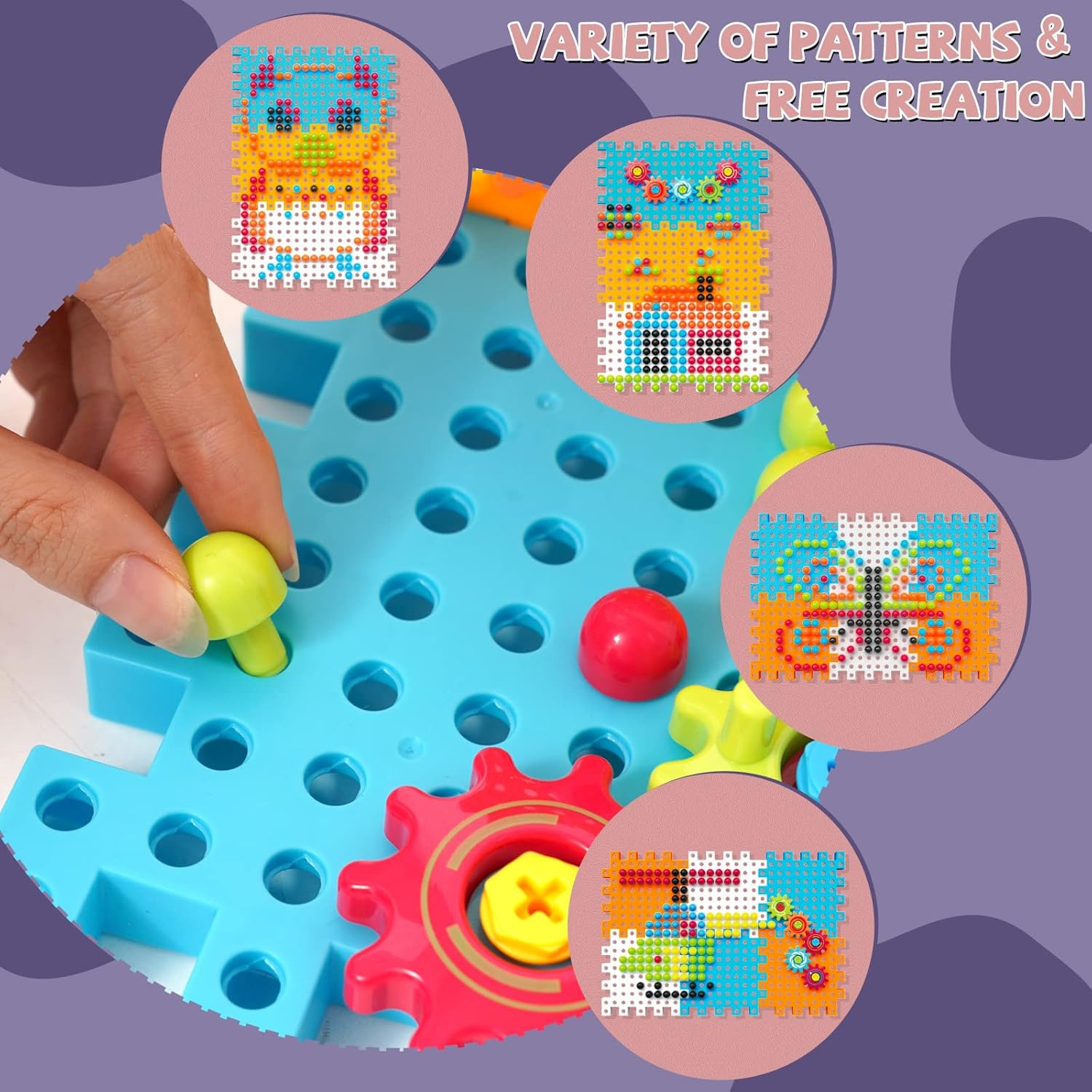 - Incluye: 110 piezas (base rompecabezas, clavijas de colores, engranajes, tornillos, tuercas y destornillador)